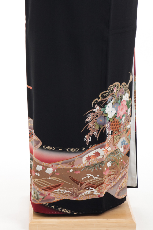 この黒留袖は、華やかなワイン系の色合いが特徴的で、伝統的な花車、熨斗、おしどりのモチーフが美しくデザインされています。花車は祝いの象徴として知られ、熨斗は祝福や願いを込めての贈り物の象徴、おしどりは夫婦の愛の象徴として知られています。