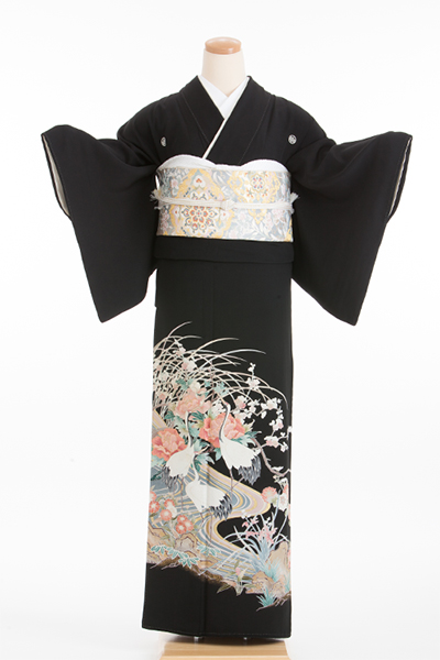 ■正絹 黒留袖 五つ紋 120042 白 牡丹 立鶴【ややゆったりサイズ】