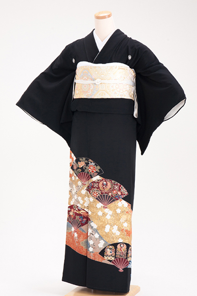 正絹 黒留袖 五つ紋 120057 金地桜 扇模様【小柄な人向け】