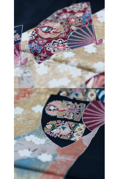 ■正絹 黒留袖 五つ紋 120057 金地桜 扇模様【小柄な人向け】
