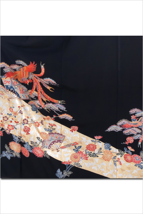 ■正絹 黒留袖 五つ紋 120058 ゴールド 鳳凰 紅型風