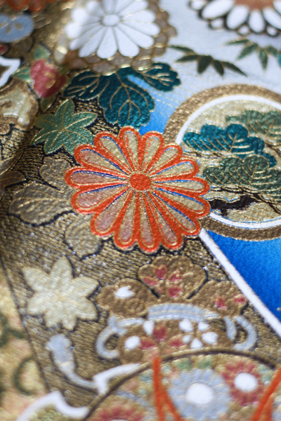 留袖の下部には、ブルーのぼかしと金箔、繊細な刺繍が施され、古典的な日本の美しさと現代の洗練が組み合わさったデザインが見受けられます。特に、淡いブルーのグラデーションが優雅さを高めており、これによって全体のデザインが一層引き立っています。
