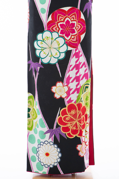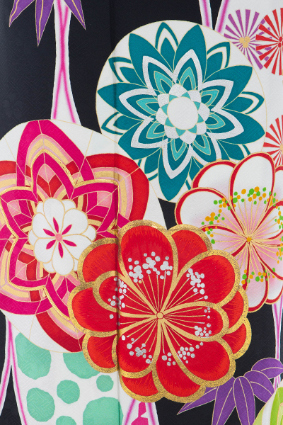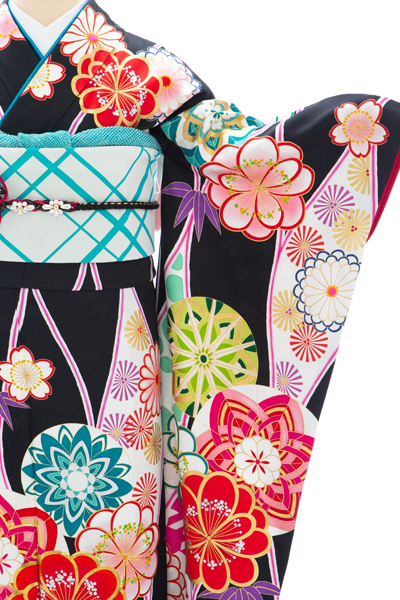 深い黒地に彩られた万華鏡のような鮮やかな花模様が特徴で、成人式の晴れの日に相応しい華やかさを演出します。ポップでカラフルなデザインは、若さと自由な精神を表現し、振袖姿を一層引き立てます。