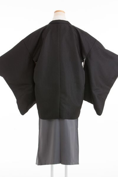 上質な黒の羽織と淡いベージュの着物、そして洗練されたグレーの袴から成る、洗練されたコーディネートセットです。
