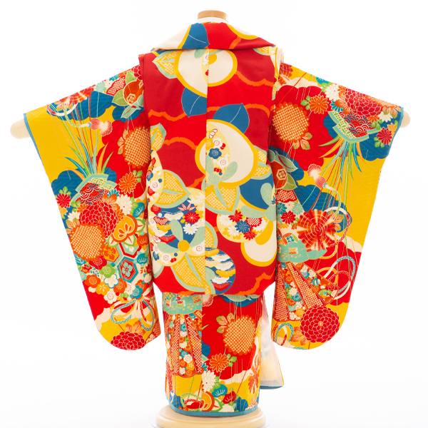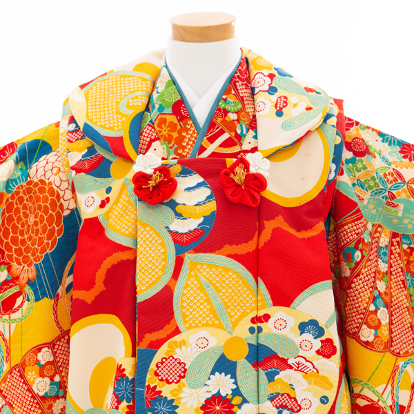 LOWRYS FARMブランドの着物。赤、青、黄、と鮮やかな色使いに伝統的な柄が織り込まれ、各所に美しい花や文様が散りばめられています。