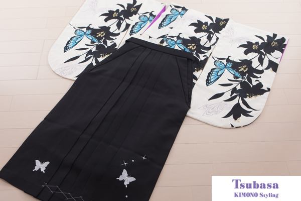 卒業式用 小振袖・袴セット 340037白地黒蝶 袴黒